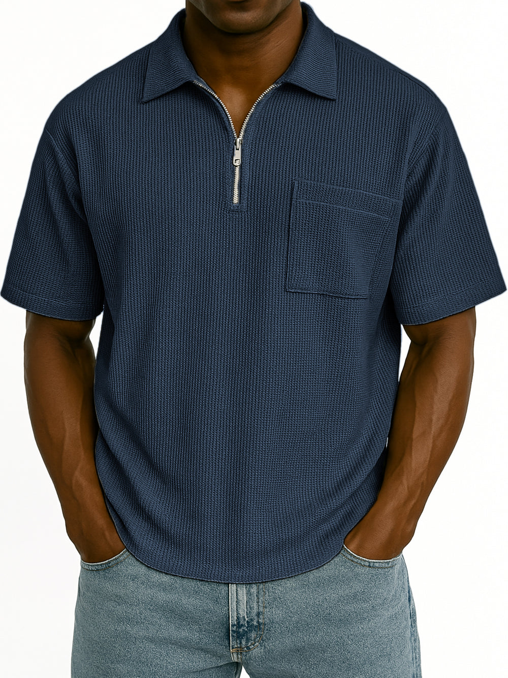Men's Comfort Waffle Quarter Zip Fashion Casual POLO Shirt with Chest Pocket