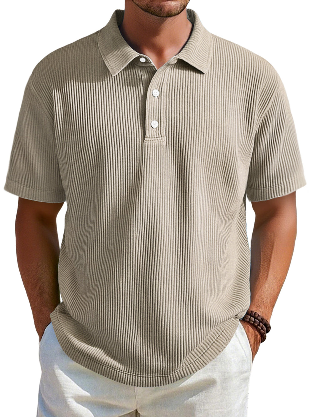 Men's Daily Ribbed Lapel Button Casual Solid Color Short-sleeved Polo Shirt