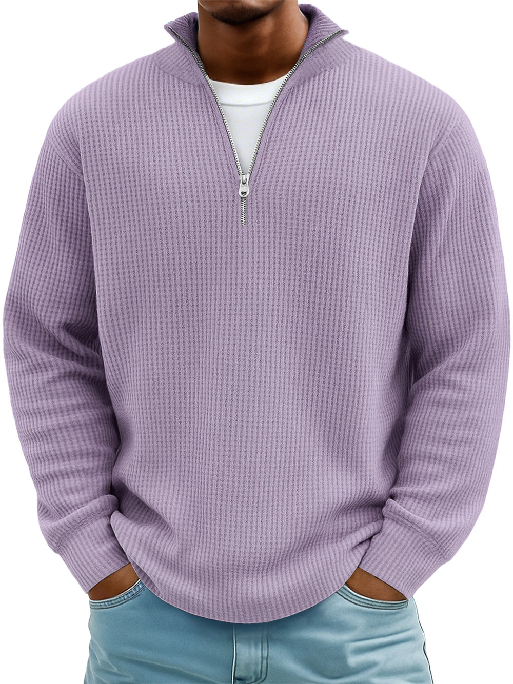 Men's Everyday Waffle Stand Collar Zipper Casual Long Sleeve T-shirt