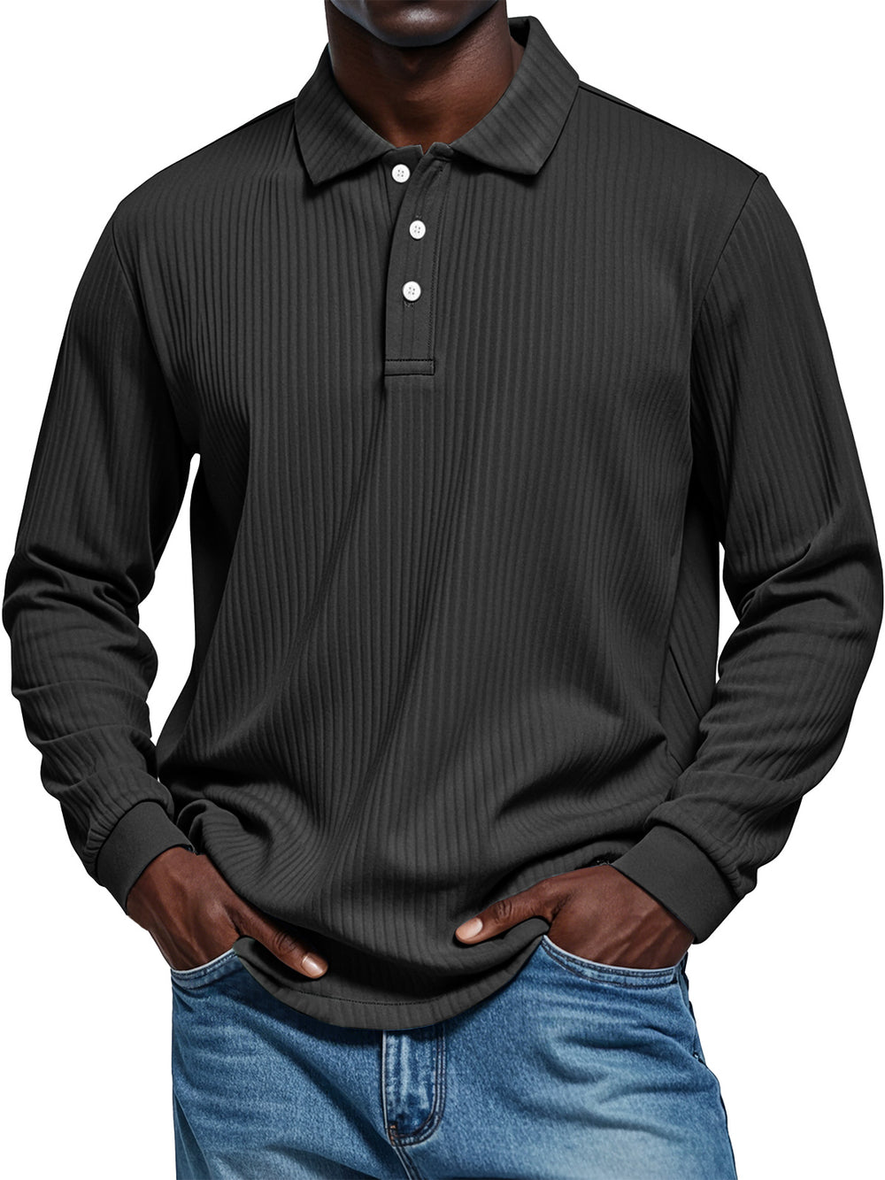 Men's Pit Texture Casual Button Solid Color Long-sleeved Polo Shirt