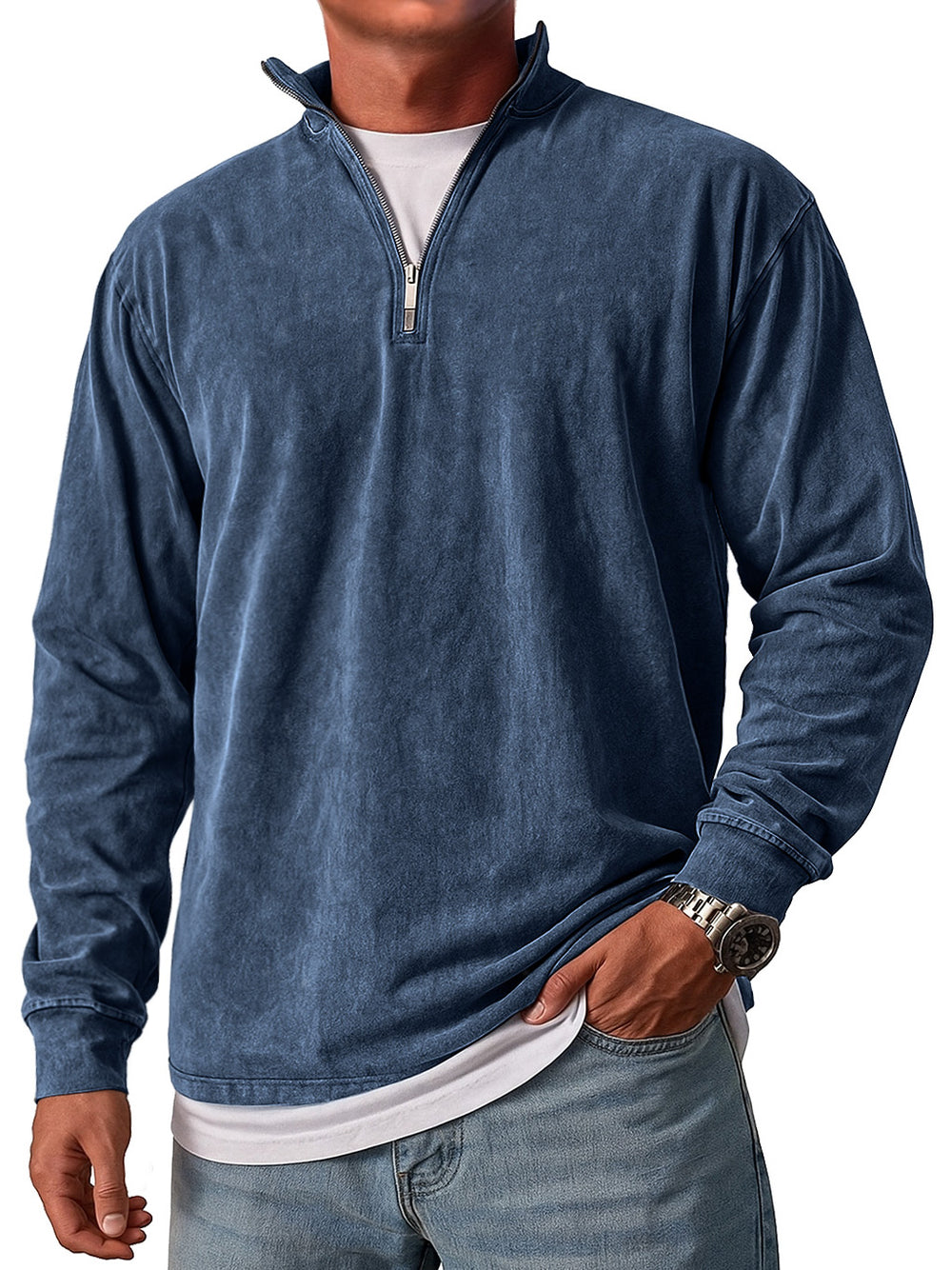 Men's Retro Stand Collar Zipper Casual Loose Solid Color Long Sleeve T-shirt