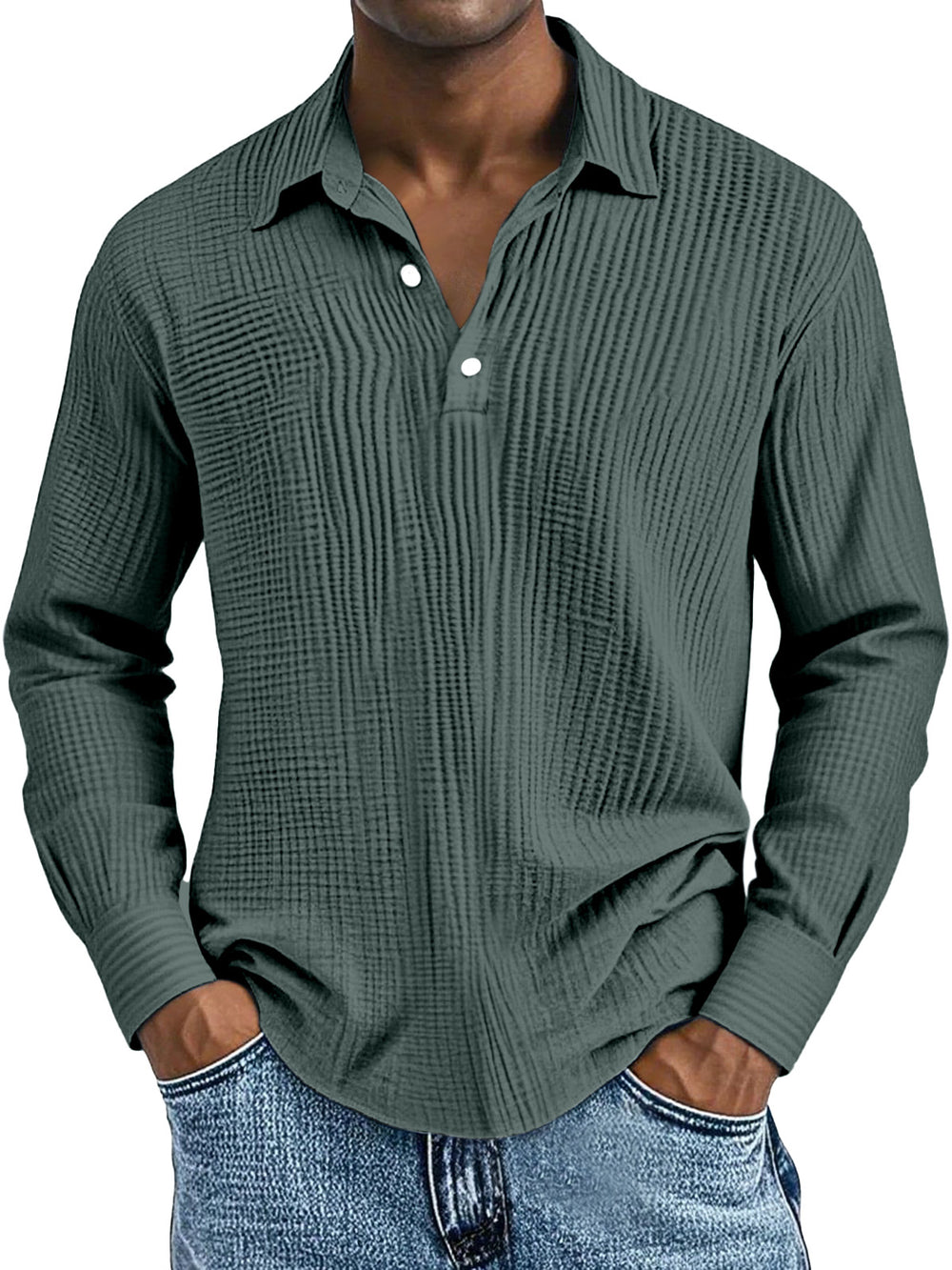Men's Simple Solid Color Breathable Pleated Lapel Long-sleeved Polo Shirt