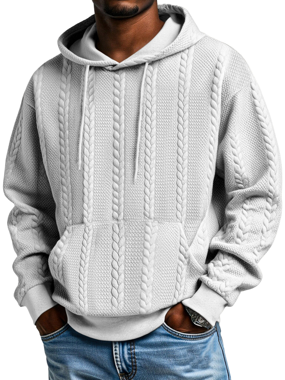 Men's Solid Color Jacquard Texture Kangaroo Pocket Long Sleeve Hooded Sweatshirt