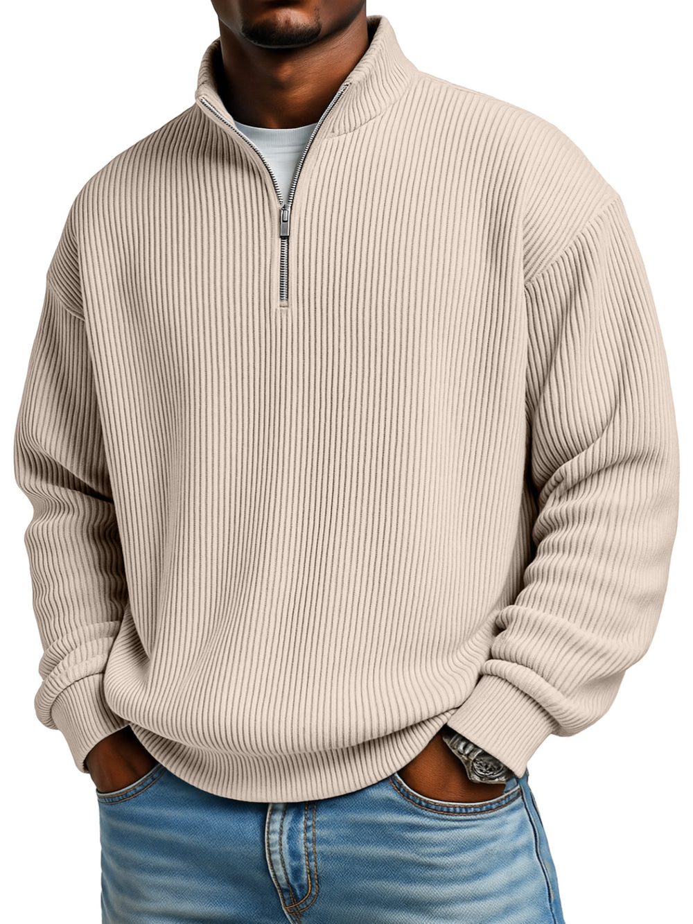 Men's Solid Color Vertical Pit Texture Stand Collar Zipper Long Sleeve Sweater