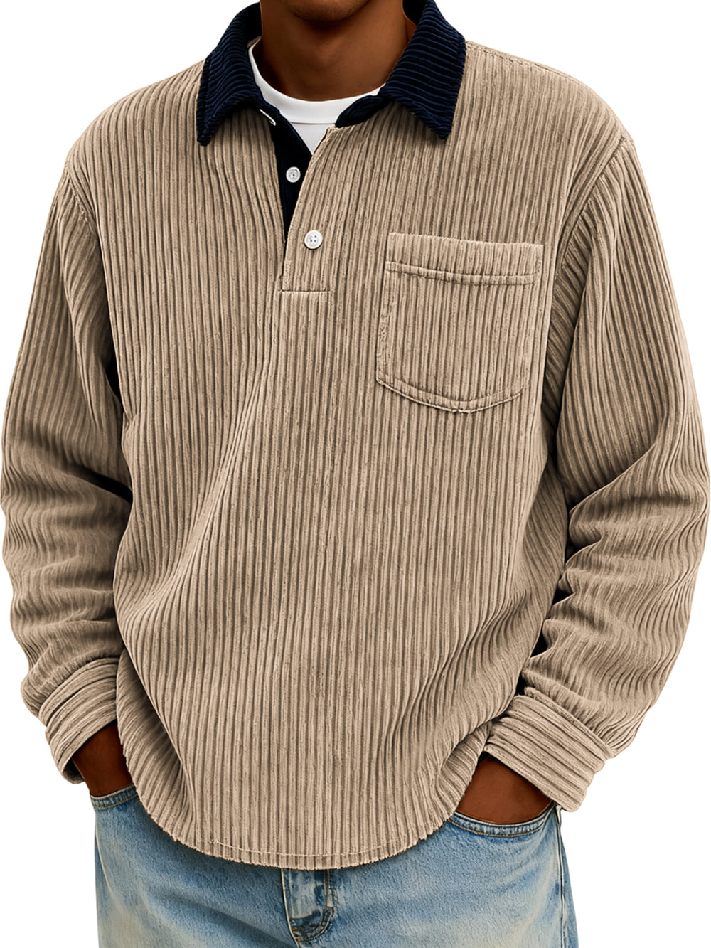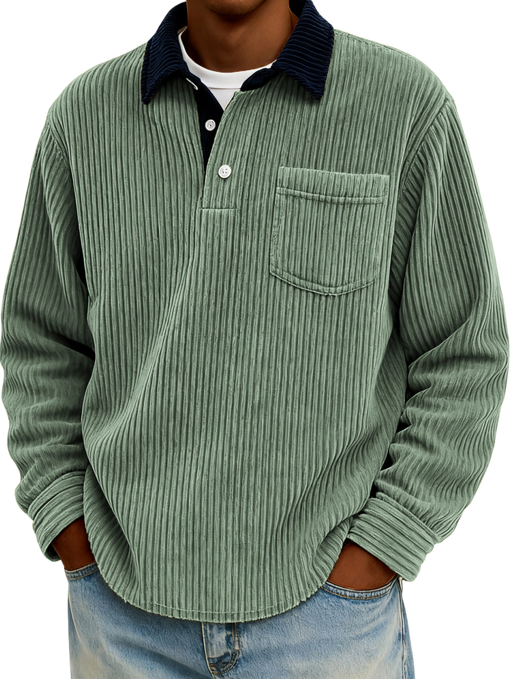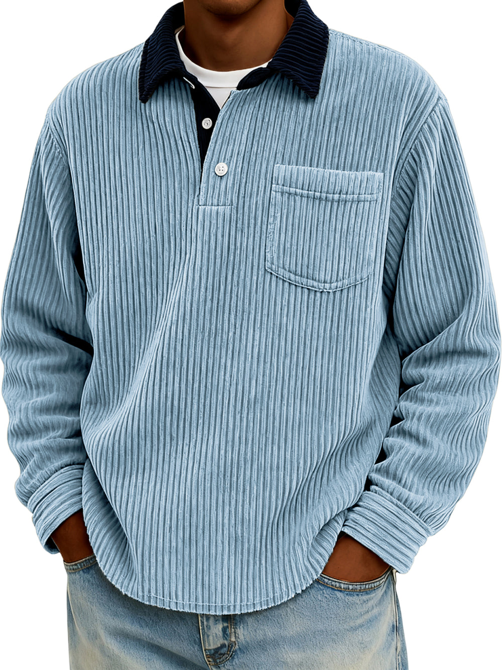 Men's Stylish Corduroy Color-Block Polo Shirt Pullover with Chest Pocket