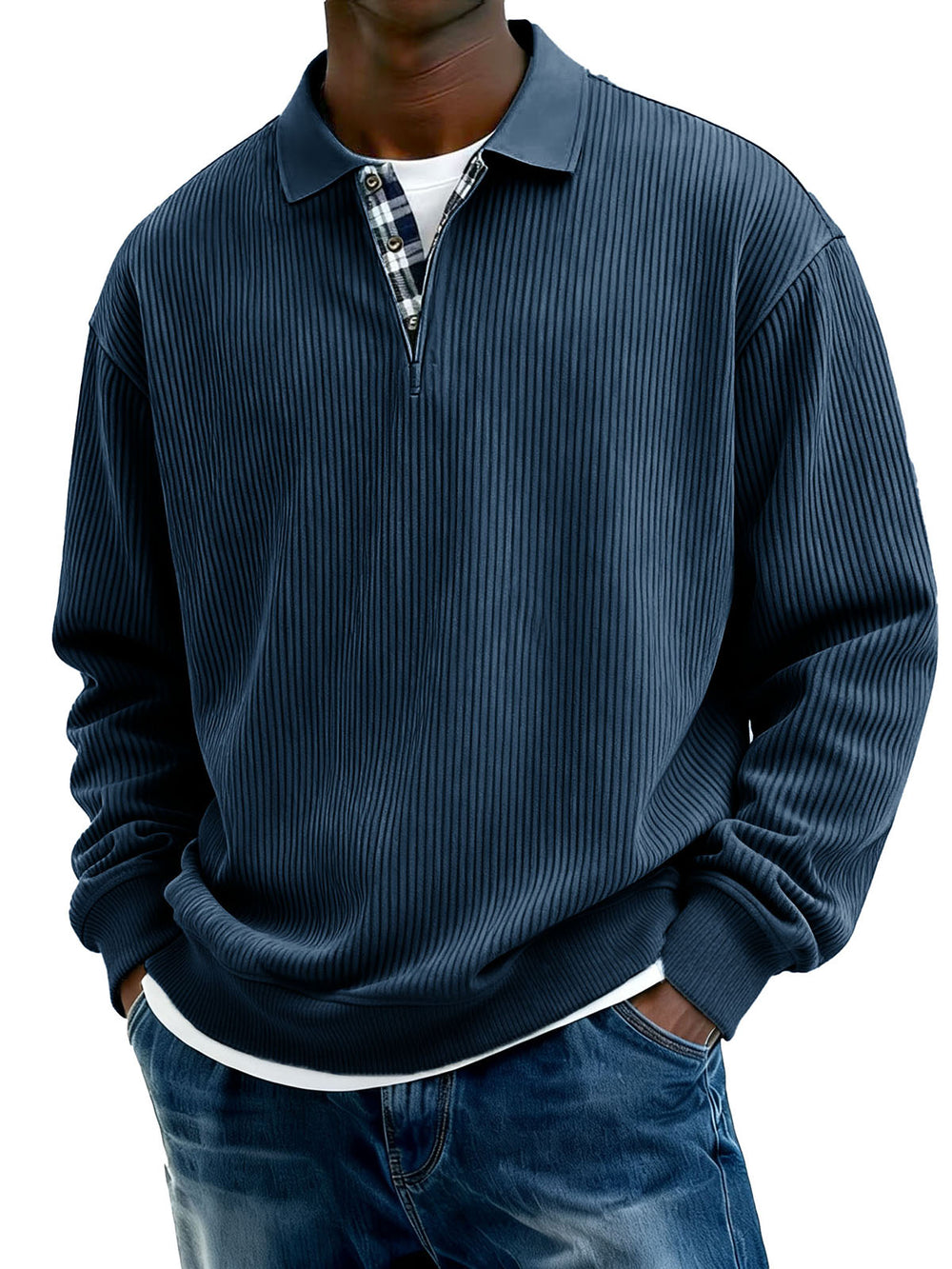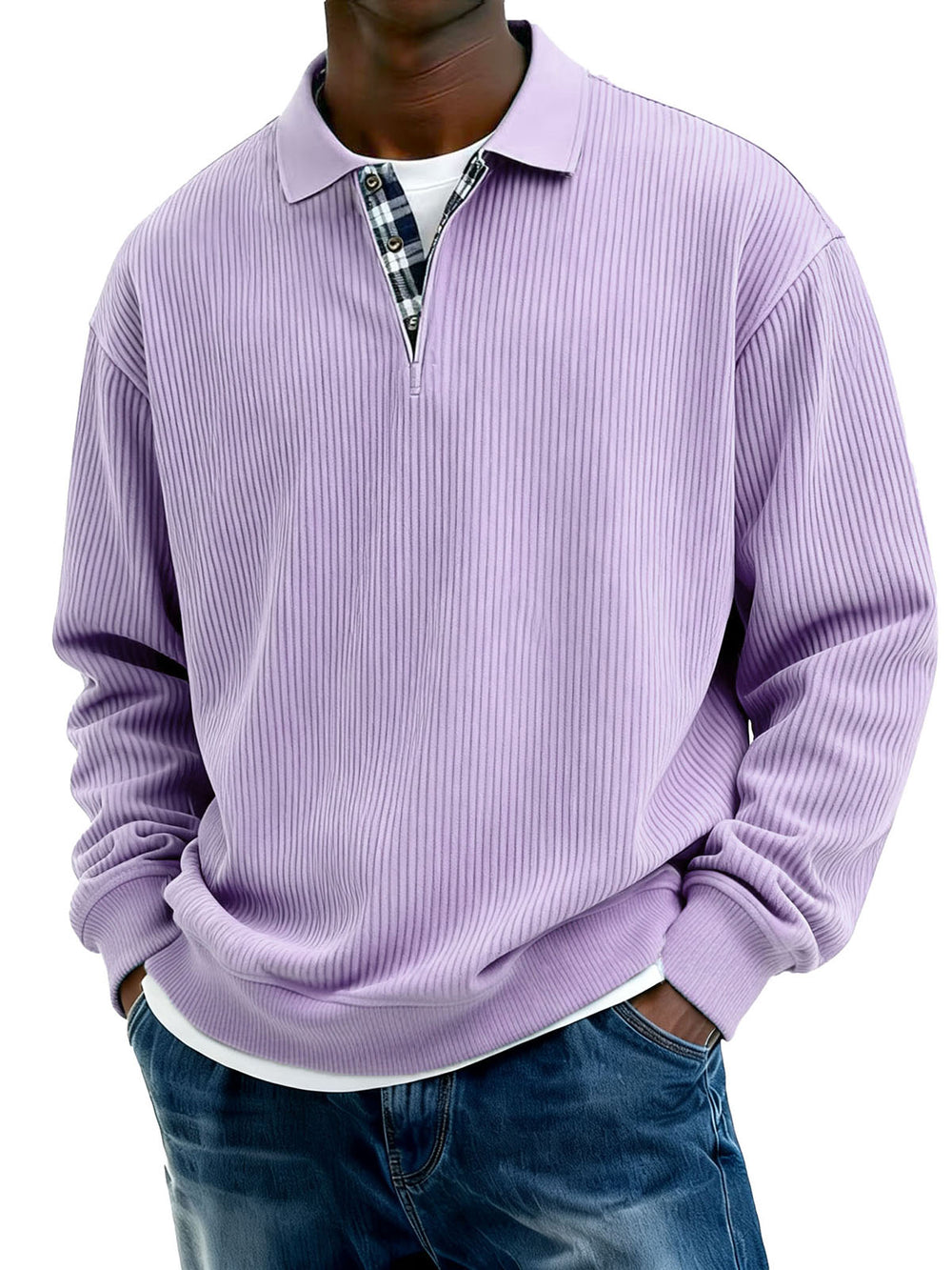Men's Stylish Everyday Plaid Placket Patchwork Ribbed Fabric Long-sleeved Polo Shirt