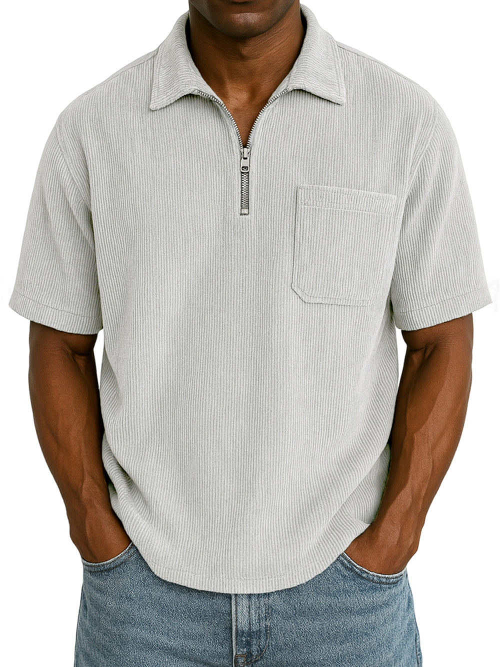 Men's Stylish Ribbed Pit Corduroy Quarter-Zip Casual Short Sleeve POLO Shirt
