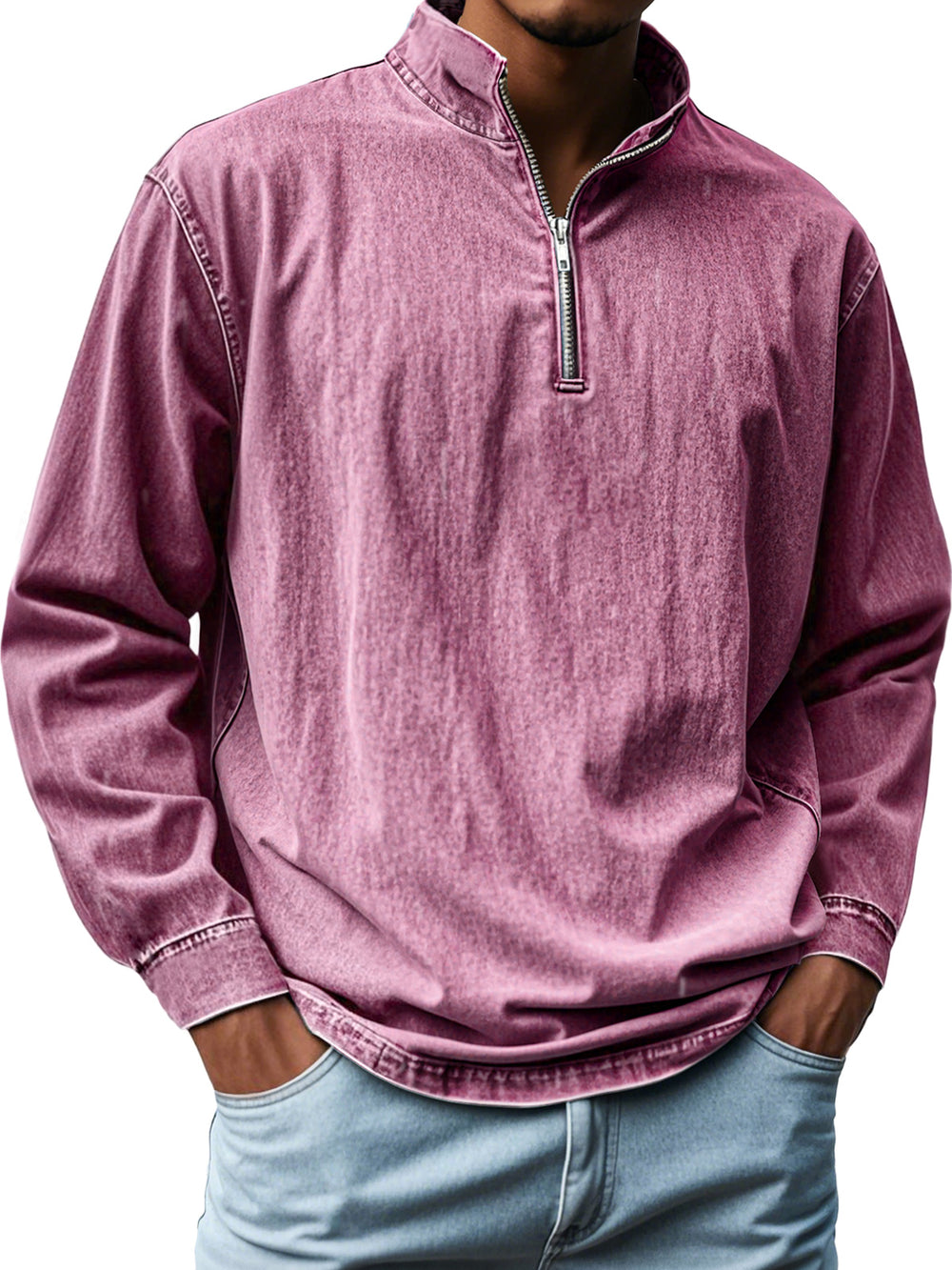 Men's Vintage Distressed Stand-up Collar Zipper Casual Long-sleeved T-shirt
