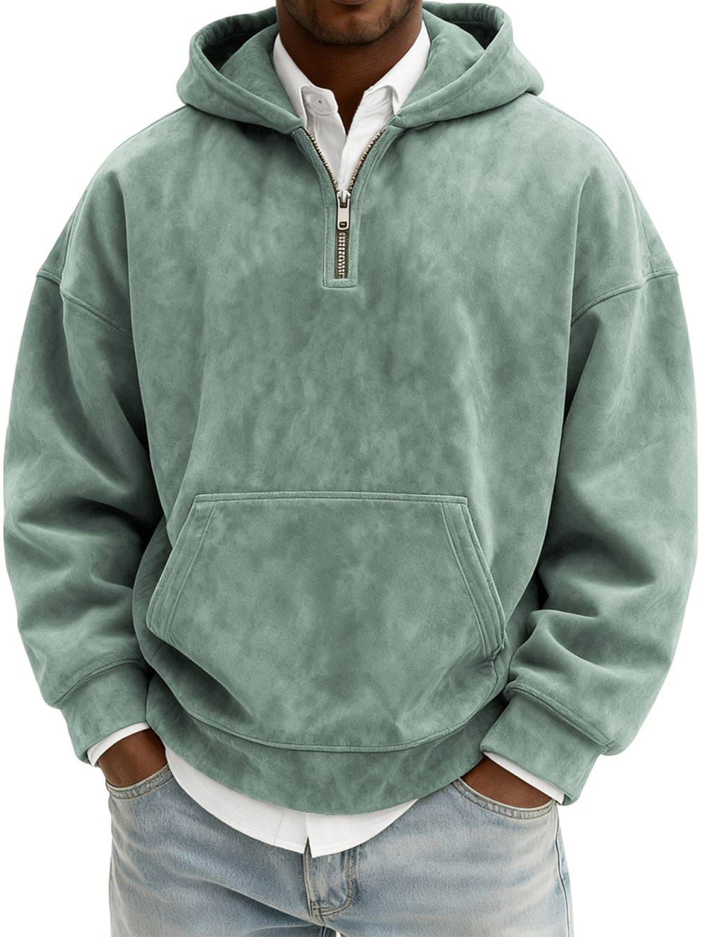 Men's Vintage Suede Quarter-Zip Hooded Sweatshirt with Kangaroo Pocket