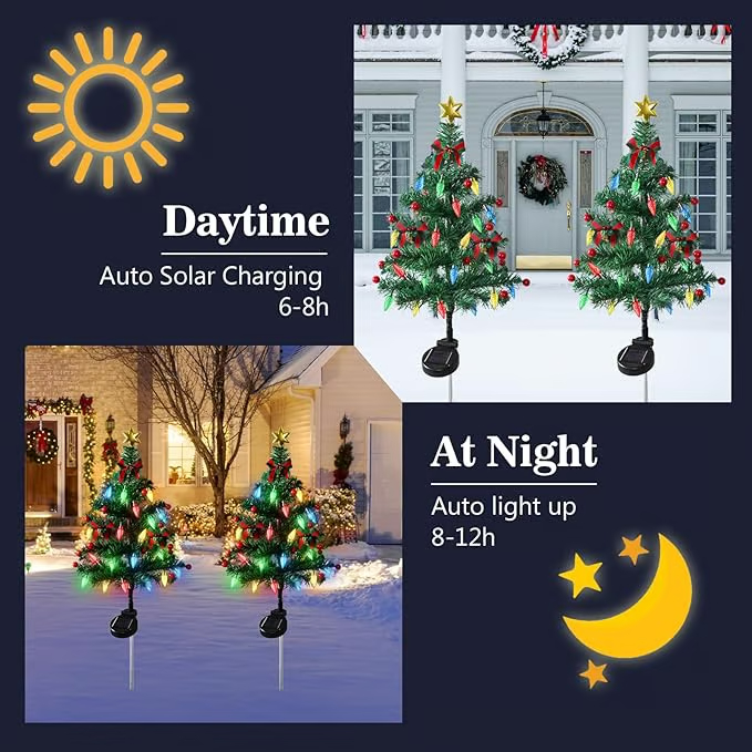 The outdoor solar garden lights with IP65 waterproof feature, even in bad weather work well and long lasting. The Xmas tree is solar energy powered, and upgraded solar panel,they can convert sun energy faster and more efficiently.